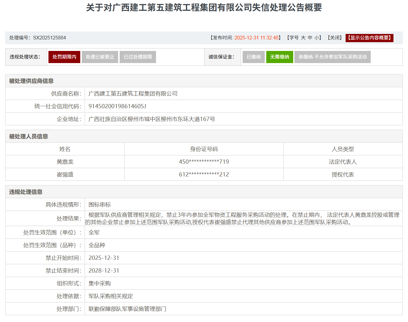 公司处罚信息 - 广西建工第五建筑工程集团有限公司因围标串标被军队采购部门处罚 [1] - 处罚结果为禁止该公司3年内参加全军物资工程服务采购活动 [1][5] - 处罚生效范围为全军、全品种 [1][5] - 处罚禁止期自2025年12月31日开始,至2028年12月31日结束 [5] 关联方连带处罚 - 在禁止期内,公司法定代表人黄鼎龙控股或管理的其他企业也被禁止参加上述范围的军队采购活动 [1][5] - 公司授权代表崔强盛被禁止代理其他供应商参加上述范围的军队采购活动 [1][5] 公司背景信息 - 广西建工第五建筑工程集团有限公司成立于1980年 [1] - 公司是绿地控股(600606)集团成员 [1] - 公司位于广西壮族自治区柳州市,是一家以从事房屋建筑业为主的企业 [1] - 公司统一社会信用代码为91450200198614605J [4]