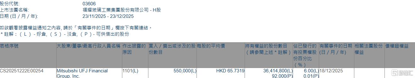 核心事件:三菱日联金融集团增持福耀玻璃H股 - 2025年12月18日,三菱日联金融集团在场内以每股均价65.7319港元增持福耀玻璃好仓55万股,涉及资金约3615.25万港元 [1] - 增持后,三菱日联金融集团持有的好仓股份总数增至3641.48万股,其持股比例由5.91%上升至6.00% [1] 权益披露详情 - 根据联交所权益披露,此次权益变动发生在2025年12月18日,相关披露文件编号为CS20251222E00254 [2] - 披露信息显示,三菱日联金融集团通过“1101(L)”栏目进行申报,其持有的有投票权股份中,3641.48万股为“Long Position”,另有92,000股为“Physical”持有 [2]