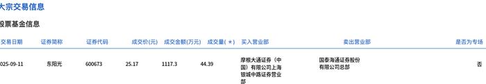 交易概况 - 东阳光于9月11日发生大宗交易成交量44.39万股[1] - 成交金额达1117.3万元人民币[1] - 成交价格25.17元与当日市场收盘价完全持平[1] - 该笔交易占当日总成交额的0.2%[1] 交易结构 - 买方为摩根大通证券(中国)有限公司上海组城中路证券营业部[2] - 卖方为国泰君安证券股份有限公司总部[2] - 交易通过专场形式进行[2] - 证券代码600673[2]