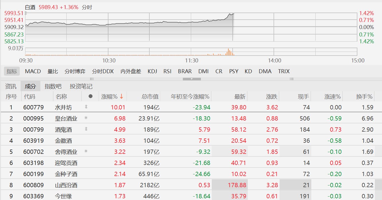 MACD金叉信号形成,这些股涨势不错! | 5993.511 | | 白酒 5989.43 +1.36% 分时 | | | | | | | | | | | | | | | --- | --- | --- | --- | --- | --- | --- | --- | --- | --- | --- | --- | --- | --- | --- | --- | | 5951.41 | | | | | | | | | | | | | | | | | 5909.32 | | | | | | | | | | | | | | | | | 5867.23 | | | | | | | | | | | | | | | | | 5825.13 | | | | | | | | | | | | | | | | | 9.03万 | | | | | | | | | | | | | | | | | 09:30 | | | | | 10:30 | | | 11:30 | | | | | 14:00 | | | | 指标 | MACD | 量比, | 分时博弈 | | 分时DDX 内外盘差 | KDJ | RSI | BRAR | DMI ...