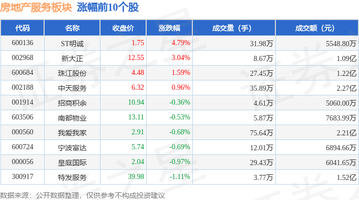 市场整体表现 - 2023年12月26日,房地产服务板块整体下跌0.11%,表现弱于大盘,当日上证指数上涨0.1%至3963.68点,深证成指上涨0.54%至13603.89点 [1] - 板块内个股表现分化,10只成分股中4只上涨,6只下跌,领涨股为ST明诚,上涨4.79%,领跌股为世联行,下跌2.01% [1][2] 个股价格与交易表现 - ST明诚收盘价1.75元,涨幅4.79%,成交量31.98万手,成交额5548.80万元 [1] - 新大正收盘价12.55元,涨幅3.04%,成交量8.67万手,成交额1.09亿元 [1] - 珠江股份收盘价4.48元,涨幅1.59%,成交量27.45万手,成交额1.22亿元 [1] - 世联行收盘价2.93元,跌幅2.01%,成交量96.55万手,成交额2.85亿元 [2] - 特发服务收盘价39.98元,跌幅1.11%,成交量3.77万手,成交额1.52亿元 [1][2] - 我爱我家收盘价2.91元,跌幅0.68%,成交量75.64万手,成交额2.21亿元 [1][2] 板块资金流向 - 房地产服务板块整体呈现主力资金净流出,净流出金额为3770.53万元 [2] - 游资资金整体净流入1282.03万元,散户资金整体净流入2488.5万元 [2] - 珠江股份获得主力资金净流入1023.67万元,主力净占比8.36%,为板块内主力资金净流入最多的个股 [3] - 新大正获得主力资金净流入982.27万元,主力净占比8.99% [3] - 宁波富达遭遇主力资金净流出1178.66万元,主力净占比-17.10%,为板块内主力资金净流出最多的个股之一 [3] - 我爱我家遭遇主力资金净流出1857.84万元,主力净占比-8.43%,为板块内主力资金净流出金额最大的个股 [3]