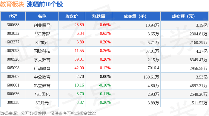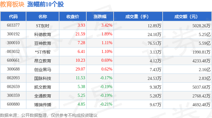 教育板块市场表现 - 2023年12月29日,教育板块整体下跌0.16%,表现弱于上证指数(上涨0.04%),但强于深证成指(下跌0.49%)[1] - 板块内个股表现分化,中国高科领跌,跌幅达4.67%,而ST东时领涨,涨幅为3.42%[1][2] - 当日教育板块主力资金净流出1.35亿元,但游资和散户资金分别净流入3822.81万元和9695.55万元,显示市场资金流向存在分歧[2] 个股价格与成交量 - 豆神教育成交量最为活跃,达76.51万手,成交额5.59亿元,股价上涨1.11%[1] - 中公教育成交量也较高,为149.30万手,成交额4.00亿元,但股价微跌0.37%[2] - 中国高科成交量达50.76万手,成交额5.74亿元,是当日跌幅最大的个股[2] - 多只ST及*ST个股成交活跃,如ST东时成交12.89万手,*ST传智成交3.13万手[1] 个股资金流向 - 豆神教育获得主力资金净流入1470.62万元,主力净占比2.63%,但散户资金净流出2367.59万元[3] - ST东时获得主力资金净流入347.64万元,主力净占比达6.91%,但游资与散户资金均为净流出[3] - 行动教育、学大教育、科德教育等个股获得主力资金小幅净流入,同时获得游资较大额净流入,例如行动教育游资净流入473.60万元,占比8.92%[3] - 创业黑马、*ST国化、*ST传智等个股遭遇主力资金净流出,其中*ST国化主力净流出129.16万元,主力净占比为-7.57%[3]