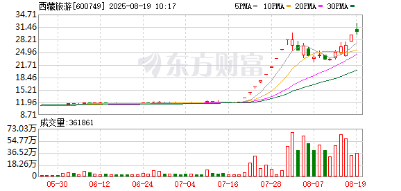 股价表现 - 股价创历史新高 报31.92元 单日涨幅8.42% [2] - 成交量1157.42万股 成交金额3.67亿元 换手率5.10% [2] - A股总市值与流通市值均为72.45亿元 [2] 行业对比 - 所属社会服务行业整体下跌0.16% [2] - 行业内25只个股上涨 西藏旅游涨幅居首 领先ST东时(5.08%)和凯撒旅业(2.46%) [2] - 50只个股下跌 跌幅最大为广东建科(-2.52%)、安车检测(-1.73%)和黄山旅游(-1.71%) [2] 财务数据 - 一季度营业收入2553.13万元 同比增长11.52% [2] - 一季度净利润-912.24万元 亏损同比收窄53.93% [2] - 基本每股收益-0.0409元 [2] - 上半年预计净利润200万元 同比大幅增长177.60% [2]