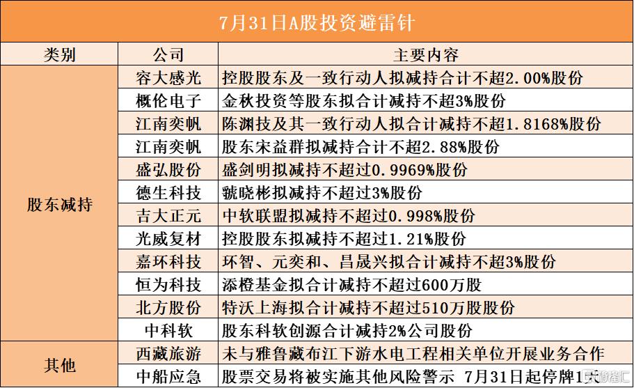 股东减持计划 - 容大感光控股股东及一致行动人拟减持合计不超过2.00%股份 [1] - 概伦电子股东金秋投资等拟合计减持不超过3%股份 [1] - 江南奕帆股东陈渊技及其一致行动人拟减持不超过1.8168%股份 股东宋益群拟减持不超过2.88%股份 [1] - 盛弘股份股东盛剑明拟减持不超过0.9969%股份 [1] - 德生科技股东號晓彬拟减持不超过3%股份 [1] - 吉大正元股东中软联盟拟减持不超过0.998%股份 [1] - 光威复材控股股东拟减持不超过1.21%股份 [1] - 嘉环科技股东环智、元奕和、昌晟兴拟合计减持不超过3%股份 [1] - 恒为科技股东添橙基金拟减持不超过600万股 [1] - 北方股份股东特沃上海拟减持不超过510万股 [1] - 中科软股东科软创源已合计减持2%公司股份 [1] 公司业务澄清 - 西藏旅游未与雅鲁藏布江下游水电工程相关单位开展业务合作 [1] 股票交易风险警示 - 中船应急股票交易将被实施其他风险警示 7月31日起停牌1天 [1]