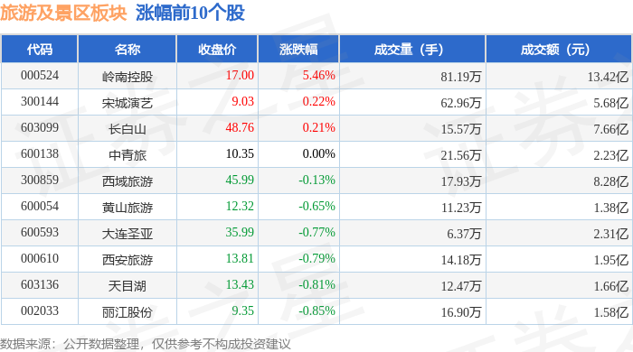 板块整体表现 - 旅游及景区板块当日下跌0.77%,领跌个股为西藏旅游(下跌7.84%)[1] - 上证指数下跌0.51%至3807.29点,深证成指下跌1.23%至12510.6点[1] - 板块内10只个股上涨,20只个股下跌,呈现普跌格局[1][2] 个股涨跌情况 - 岭南控股涨幅最高达5.46%,收盘价17.00元,成交额13.42亿元[1] - 西藏旅游跌幅最深达7.84%,收盘价20.69元,成交额6.83亿元[2] - 宋城演艺微涨0.22%至9.03元,成交额5.68亿元;长白山微涨0.21%至48.76元,成交额7.66亿元[1] 资金流向分析 - 板块主力资金净流出3.79亿元,游资净流出1842.97万元,散户资金净流入3.97亿元[2] - 西域旅游获主力资金净流入2927.60万元(占比3.54%),为板块内最大净流入个股[3] - 岭南控股遭主力净流出4964.90万元(占比3.70%),中青旅主力净流出1251.35万元(占比5.62%)[3] 成交活跃度 - 天府文旅成交量最高达161.72万手,成交额10.77亿元[2] - 凯撒旅业成交量130.28万手,成交额7.56亿元;岭南控股成交量81.19万手[1][2] - 九华旅游成交量最低仅3.44万手,成交额1.31亿元[2]