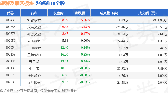 板块整体表现 - 旅游及景区板块当日下跌1.92%,显著跑输大盘,上证指数上涨0.38%,深证成指上涨0.61% [1] - 板块内个股分化明显,10只个股上涨或平盘,10只个股下跌,领跌股西藏旅游单日跌幅达9.15% [1][2] - 板块成交活跃,总成交额超过100亿元,其中西藏旅游成交8.76亿元,长白山成交11.76亿元 [2] 个股涨跌情况 - ST张家界涨幅最大达5.06%,收盘价60.8元,成交额7921.98万元 [1] - 西藏旅游跌幅最深达9.15%,收盘价22.45元,成交量37.47万手 [2] - 长白山跌幅8.24%位列第二,收盘价48.66元,成交额11.76亿元 [2] - 天府文旅涨幅3.13%,成交额15.59亿元,成交量225.46万手居板块首位 [1] 资金流向分析 - 板块主力资金净流出7.3亿元,游资资金净流出4086.37万元,散户资金净流入7.71亿元 [2] - 九华旅游主力资金净流入1406.04万元,主力净占比6.88%,游资净流入1753.72万元,占比8.58% [3] - ST张家界主力资金净流入1146.32万元,主力净占比14.47%,但游资和散户均呈净流出状态 [3] - 曲江文旅主力资金净流出1292.11万元,占比5.66%,散户资金净流入1565.80万元,占比6.86% [3]