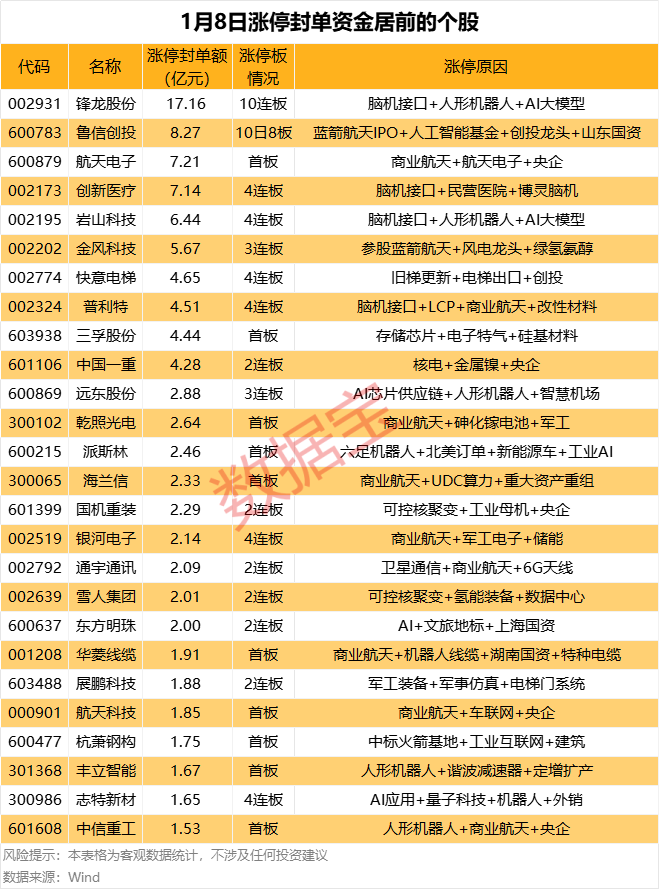 市场整体表现 - 截至1月8日收盘,上证指数报4082.98点,下跌0.07%;深证成指报13959.48点,下跌0.51%;创业板指下跌0.82%;科创50指数上涨0.82% [1] - 当日可交易A股中,上涨个股3731只,占比超68%,下跌个股1595只 [1] - 收盘封死涨停个股110只,42股封板未遂,整体封板率为72.37% [1] 涨停个股行业分布 - 涨停个股数量居前的行业为机械设备、基础化工、国防军工,分别有22只、12只、12只 [1] - 封死涨停股中,有19只为ST股,例如*ST亚太、*ST节能 [1] 个股涨停特征分析 - 锋龙股份连续涨停天数最多,已连收10个涨停板 [1] - 以涨停板封单金额计算,锋龙股份、鲁信创投、航天电子封单资金较多,分别为17.16亿元、8.27亿元、7.21亿元 [1] - 以封单力度(封单量占流通A股比例)计算,锋龙股份、快意电梯、派斯林力度较大,分别为18.37%、12.15%、6.99% [1] 热门涨停股详情 - 锋龙股份(002931)封单额17.16亿元,10连板,涉及脑机接口、人形机器人、AI大模型概念 [2] - 鲁信创投(600783)封单额8.27亿元,10日8板,涉及蓝箭航天IPO、人工智能基金、创投龙头、山东国资概念 [2] - 航天电子(600879)封单额7.21亿元,首板,涉及商业航天、航天电子、央企概念 [2] - 创新医疗(002173)封单额7.14亿元,4连板,涉及脑机接口、民营医院、博灵脑机概念 [2] - 岩山科技(002195)封单额6.44亿元,4连板,涉及脑机接口、人形机器人、AI大模型概念 [2] - 全风科技(002202)封单额5.67亿元,3连板,涉及参股蓝箭航天、风电龙头、绿氢氨醇概念 [2] - 快意电梯(002774)封单额4.65亿元,4连板,涉及旧梯更新、电梯出口、创投概念 [2] - 普利特(002324)封单额4.51亿元,4连板,涉及脑机接口、LCP、商业航天、改性材料概念 [2] - 三字股份(603938)封单额4.44亿元,首板,涉及存储芯片、电子特气、硅基材料概念 [2] - 中国一重(601106)封单额4.28亿元,2连板,涉及核电、金属镓、央企概念 [2] 市场热点概念 - 商业航天概念受关注,相关涨停股包括航天电子、全风科技、普利特、乾照光电、海兰信、银河电子、通宇通讯、华菱线缆、航天科技、杭萧钢构、中信重工等 [2] - 脑机接口概念活跃,相关涨停股包括锋龙股份、创新医疗、岩山科技、普利特等 [2] - 人形机器人概念受追捧,相关涨停股包括锋龙股份、岩山科技、远东股份、派斯林、丰立智能、志特新材、中信重工等 [2] - AI相关概念(如AI大模型、AI应用)出现在锋龙股份、岩山科技、东方明珠、志特新材等涨停股中 [2] - 可控核聚变概念出现在国机重装、雪人股份等涨停股中 [2]