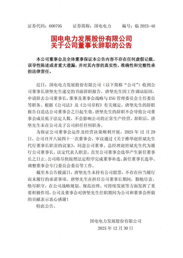公司管理层变动 - 国电电力发展股份有限公司董事长唐坚于近日辞职[1] - 辞职原因为工作调动[1] - 唐坚辞去了公司董事长、董事及董事会战略与ESG管理委员会主任委员等全部职务[1] - 辞职后,唐坚未在公司及子公司担任任何职务[1]