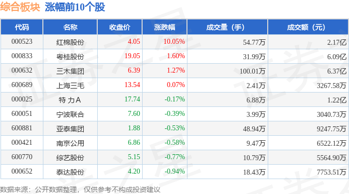 | 代码 | 名称 | 收盘价 | 涨跌幅 | 成交量(手) | 成交额(元) | | | --- | --- | --- | --- | --- | --- | --- | | 000523 | 红棉股份 | 4.05 | 10.05% | 54.77万 | | 2.17亿 | | 000833 | 粤桂股份 | 19.05 | 1.60% | 31.99万 | | 6.09亿 | | 000632 | 三木集团 | 6.39 | 1.27% | 100.01万 | | 6.37亿 | | 600689 | 上海三毛 | 13.54 | 0.07% | 2.41万 | | 3267.58万 | | 000025 | 特 | 17.74 | -0.17% | 6.88万 | | 1.22亿 | | 600051 | 宁波联合 | 7.60 | -0.39% | 3.99万 | | 3040.73万 | | 600881 | 亚泰集团 | 1.88 | -0.53% | 48.94万 | | 9247.75万 | | 000421 | 南京公用 | 6.86 | -0.58% | 9.47万 | | 6522. ...