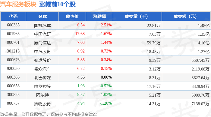 | 代码 | 名称 | 收盘价 | 涨跌幅 | 成交量(手) | 成交额(元) | | | --- | --- | --- | --- | --- | --- | --- | | 600676 | 交运股份 | 5.83 | 2.46% | 7.99万 | | 4631.88万 | | 300825 | 阿尔特 | 9.67 | 1.79% | 6.76万 | | 6503.47万 | | 000701 | 厦门信达 | 6.93 | 1.17% | 44.43万 | | 3.07亿 | | 601965 | 中国汽研 | 17.39 | 0.99% | 4.46万 | | 7720.92万 | | 301215 | 中汽股份 | 6.87 | 0.73% | 14.02万 | | 9608.31万 | | 600822 | 上海物贸 | 11.05 | 0.64% | 5.82万 | | 6430.09万 | | 600653 | 申华控股 | 1.94 | 0.52% | 16.13万 | | 3126.23万 | | 000757 | 浩物股份 | 5.00 | 0.40% | 6.87万 | | 34 ...