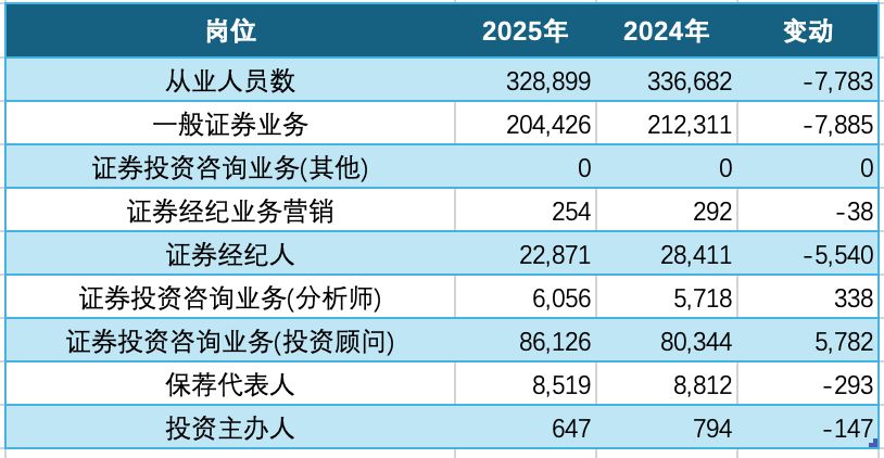 2025年证券从业者跌破33万大关 互联网券商逆势扩招,保代8年来首现年度减员