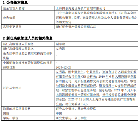 公司高管任命 - 上海国泰海通证券资产管理有限公司任命左秀海为公司副总裁,任职日期为2025年12月24日 [1][2][3] - 此次高管变更类型为“新任证券资产管理公司副总裁”,公告依据为《公开募集证券投资基金信息披露管理办法》等相关规定 [2] 新任高管背景 - 新任副总裁左秀海拥有研究生学历和硕士学位,并持有证券从业资格与基金从业资格 [3] - 左秀海为中共党员,现任上海国泰海通证券资产管理有限公司党委副书记 [1][3] - 其职业生涯始于2008年5月,在华宝证券有限责任公司担任CRM分析员 [1][3] 职业履历详情 - 左秀海于2010年6月加入海通证券股份有限公司,历任销售交易总部交易管理部经理、零售与网络金融部交易管理部经理、财富管理中心交易管理部经理、总经理助理及副总经理等多个职务 [1][3] - 2021年5月,其入职上海海通证券资产管理有限公司,担任投资总监兼组合投资部总监 [1][3] - 2025年12月,左秀海加入上海国泰海通证券资产管理有限公司并获任现职 [1][3]