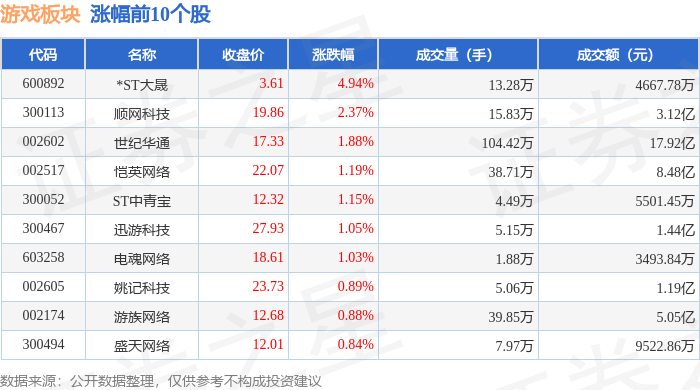 证券之星消息,12月25日游戏板块较上一交易日上涨0.51%,*ST大晟领涨。当日上证指数报收于3959.62,上涨0.47%。深证成指报收于 13531.41,上涨0.33%。游戏板块个股涨跌见下表: | 涨幅前10个股 | | --- | | 代码 | 名称 | 收盘价 | 涨跌幅 | 成交量(手) | 成交额(元) | | --- | --- | --- | --- | --- | --- | | 600892 | *ST大晟 | 3.61 | 4.94% | 13.28万 | - 4667.78万 | | 300113 | 顺网科技 | 19.86 | 2.37% | 15.83万 | - 3.12 乙 | | 002602 | 世纪委通 | 17.33 | 1.88% | 104.42万 | 17.92亿 | | 002517 | 恺英网络 | 22.07 | 1.19% | 38.71万 | 8.48亿 | | 300052 | ST中青宝 | 12.32 | 1.15% | 4.49万 | 5501.45万 | | 300467 | 迅游科技 | 27.93 | 1.05% | 5.15万 | ...