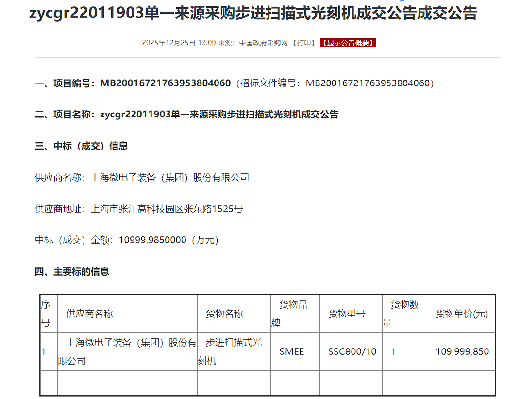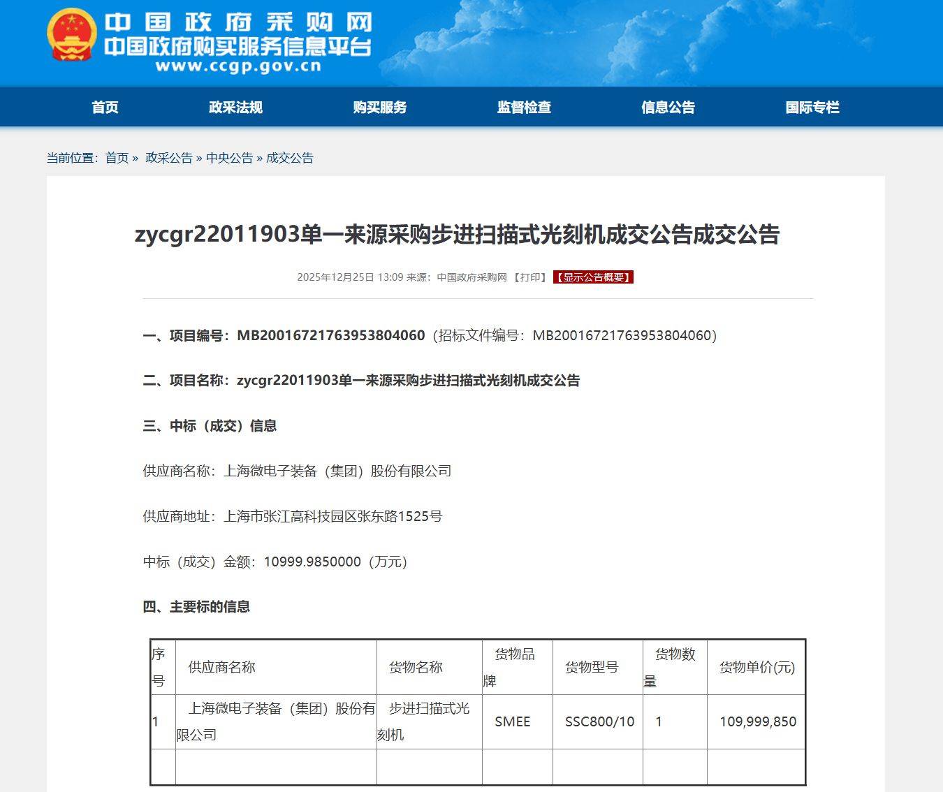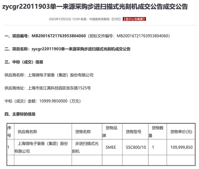 12月25日,据中国政府采购网发布的公告显示,上海微电子装备(集团)股份有限公司中标 zycgr22011903采购步进扫描式光刻机项目,设备数量为一台,成交金额10999.985万元。供应商地址为 上海市张江高科技园区张东路1525号。 编辑 | 钉钉 (头图由AI生成) | | 供应商名称 | 货物名称 | 货物品 | 货物型号 | 货物数 | 货物单价(元) | | --- | --- | --- | --- | --- | --- | --- | | | | | 版 | | 13 21 | | | | 上海微电子装备(集团) 股份 有限公司 | 步进扫描式光 刻机 | SMEE | SSC800/10 | 1 | 109,999,850 | | 115 름 | | | | | | | 张江高科盘中一度大幅拉升涨超8%,截至收盘,涨幅收窄至4.81%,最新股价报42.48元/股。 ...