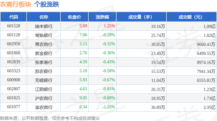 从资金流向上来看,当日农商行板块主力资金净流出6353.1万元,游资资金净流入4798.77万元,散户资 金净流入1554.33万元。农商行板块个股资金流向见下表: | 代码 | 名称 | 主力净流入(元) | 主力净占比 游资净流入(元) | | 游资净占比 散户净流入(元) | | 散户净占比 | | --- | --- | --- | --- | --- | --- | --- | --- | | 002839 | 张家港行 | 610.81万 | 6.81% | 646.52万 | 7.20% | -1257.33万 | -14.01% | | 002958 青农商行 | | -52.51万 | -0.54% | -1299.70万 | -13.45% | 1352.21万 | 14.00% | | 601528 瑞丰银行 | | -208.02万 | -1.91% | -365.91万 | -3.37% | 573.93万 | 5.28% | | 601128 常熟银行 | | -235.53万 | -1.30% | 445.57万 | 2.45% | -210.03万 | -1.16% | | 6 ...