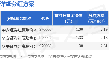 基金分红方案 - 华安证券汇赢增利混合型集合资产管理计划于2025年8月19日发布分红公告 为2025年度第1次分红 [1] - 收益分配基准日为2025年8月8日 A类份额(代码970006)基准日净值1.30元 分红方案为每10份派现2.19元 [1] - B类份额(代码970007)基准日净值1.33元 分红方案为每10份派现2.18元 C类份额(代码970008)基准日净值1.38元 分红方案为每10份派现2.61元 [1] 分红实施安排 - 权益登记日设定为2025年8月21日 现金红利发放日为2025年8月25日 [1] - 选择红利再投资的投资者将以2025年8月21日份额净值为基准转换份额 转换份额于8月22日划入账户 [1] - 投资者可自2025年8月25日起查询和赎回红利再投资所得份额 [1] 税务与费用政策 - 根据财政部、国家税务总局规定 基金向投资者分配的收益暂免征收所得税 [1] - 本次分红免收分红手续费 红利再投资转换的份额免收申购费用 [1]