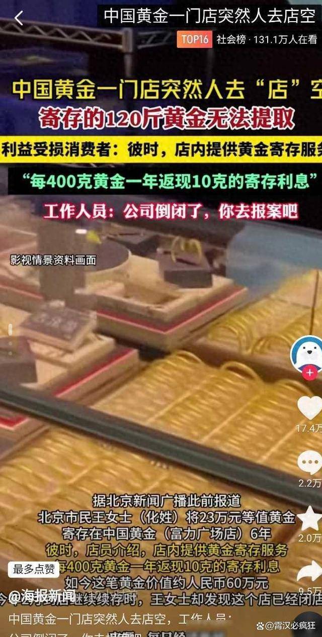 在金融投资的道路上,大家总是希望顺风顺水,但有时候现实却给我们带来沉重的打击。最近,北京朝 阳区双井富力广场的一家中国黄金概念店突然关门,许多投资者因此遭受重创,他们的辛苦积蓄瞬间化 为乌有。这不仅仅是一场普通的金融诈骗,更是一次关于投资陷阱的惨痛警示。 中国黄金曾经是备受信赖的国企品牌,口碑一直不错。可是,这次却成为了投资者的噩梦源头。店家以 托管业务为名,承诺可以帮助投资者赚取更高利润,实际上这却是一个精心策划的陷阱。他们在背后偷 偷摸索,暗中挪用消费者的财富,造成了严重的经济损失。 许多投资者受到了高利率的诱惑,把自己的黄金交给了这些商家托管,却没有意识到隐藏的巨大风险。 他们一心想着追求更多的利润,却忽略了对投资市场的理性分析,也没有提升自己对投资风险的警觉。 | 成色 | 6666 19 | | --- | --- | | | 1 250/2 50/50/100/20 | | 规格 | SALE AND SECRECT USD FOR COURS | | | 10001下(空10克): +30元/完 (C) (C) Carl Child Com (Reserver | | | 6155 第81基礎金 ...