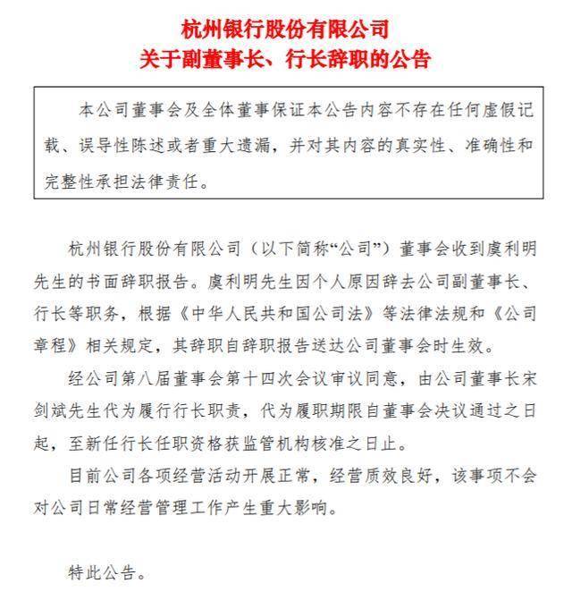 | 姓名 | 离任职务 | 辞职信送 | 原定任期 | 离任原因 | 是否继续 在上市公 | 是否存在 未履行完 | | --- | --- | --- | --- | --- | --- | --- | | | | 达时间 | 到期日 | | 司任职 | 毕的公开 | | | | | | | | 承诺 | | 壬立雄 | 监事长、职 工监事、监 | 2025 年 12 | 2026 年 7 | 岗位调整 | 是 | 否 | | | 事会监督委 | 月 17 日 | 月 17 日 | | | | | | 员会委员 | | | | | | 公开资料显示,王立雄曾任杭州银行副行长约6年,后转任监事长,此次又回归到高级管理层,担任副行长职务。 12月17日,杭州银行发布公告称,该行监事会收到监事长、职工监事王立雄提交的书面辞职报告。因岗位调整的原因,王立雄申请辞去第八届监事会监事 长、职工监事及监事会监督委员会委员职务。王立雄辞任后,继续担任党委委员,同时,将担任副行长。 2025年4月2日,杭州银行发布公告,虞利明因个人原因辞去副董事长、行长等职务。此后,该行行长一职便空缺至今。而代行行长职责的宋剑斌,至今已代 ...