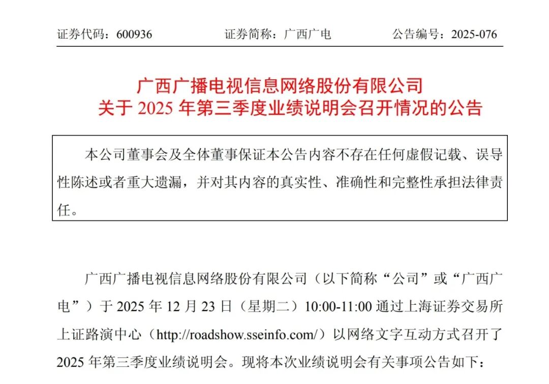 综合整理|苗梦佳 12月23日,广西广电召开2025年第三季度业绩说明会,针对2025年第三季度的经营成果及财务指标的具体情况,公司管理层主要成员与投资者进行互动交 流。 对此,广西广电在业绩说明会上表示本次重大资产置换完成后,上市公司已退出广电有线传输、数据宽带等业务,打造以数智工程、勘察设计与试验检 测、新材料及机电设备的生产与销售等为主营业务的上市公司,公司将积极参与行业数字化转型,持续推动新一代信息技术在智慧交通领域的应用。公司 作为北投集团重要上市平台,根据公司控股股东北投集团相关承诺,其将尽力督促下属广西交通设计集团有限公司与广西北投信创科技投资集团有限公司 等科技型企业于本次重组完成后5年内达到注入上市公司的条件,将有利于进一步优化上市公司"勘察设计-技术研发-数字赋能-产业转化"的科技创新与产 业协同链条,该事项的实施进度、具体方案及最终结果存在不确定性,具体以公司披露的定期报告及相关公告信息为准。 此外,广西广电还提到,公司控股子公司交科集团承建跨境智慧口岸——中越友谊关-友谊智慧口岸中方段项目等。未来,公司将充分探索各业务板块的 竞争优势,实现资源互补,进一步开拓东盟国家等海外市场。 据了 ...