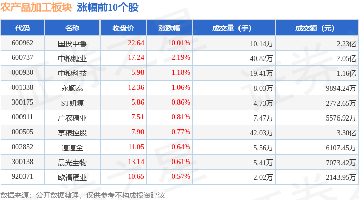 | 代码 | 名称 | 收盘价 | 涨跌幅 | 成交量(手) | 成交额(元) | | --- | --- | --- | --- | --- | --- | | 300268 | *ST佳沃 | 13.05 | -3.97% | 4.05万 | 5330.64万 | | 605198 | 安德利 | 39.33 | -1.45% | 2.35万 | 9259.46万 | | 002286 | 保龄宝 | 9.62 | -0.41% | 13.59万 | 1.31亿 | | 000972 | *ST中真 | 4.04 | 0.00% | 13.43万 | 5376.40万 | | 920023 | 田野股份 | 4.61 | 0.00% | 15.50万 | 7130.90万 | | 600127 | 金健米业 | 6.78 | 0.15% | 20.66万 | 1.40亿 | | 920273 | 一致魔手 | 33.82 | 0.18% | 1.85万 | 6276.18万 | | 002481 | 双塔食品 | 5.19 | 0.19% | 16.95万 | 8771.99万 | | 300999 | ...