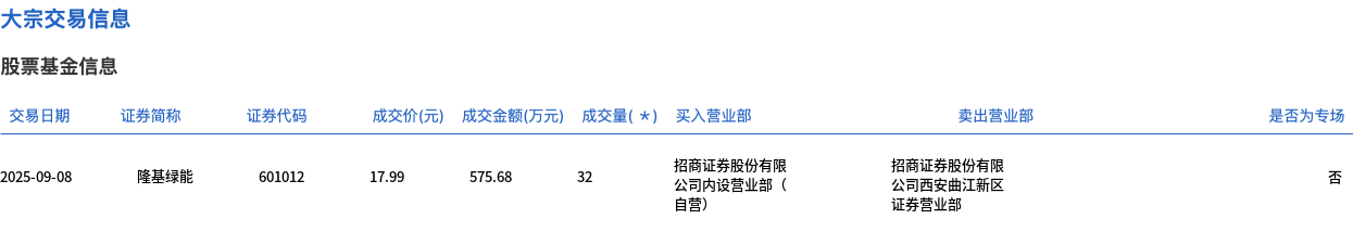大宗交易概况 - 隆基绿能于9月8日发生大宗交易成交32万股,成交金额575.68万元,占当日总成交额0.15% [1] - 成交价格17.99元与市场收盘价17.99元完全持平 [1] 交易细节 - 证券代码601012,通过招商证券股份有限公司内设营业部进行交易 [2] - 买入方为招商证券内设营业部,卖出方为招商证券西安曲江新区营业部 [2] - 单笔成交金额575.68万元,成交均价17.99元/股 [2]