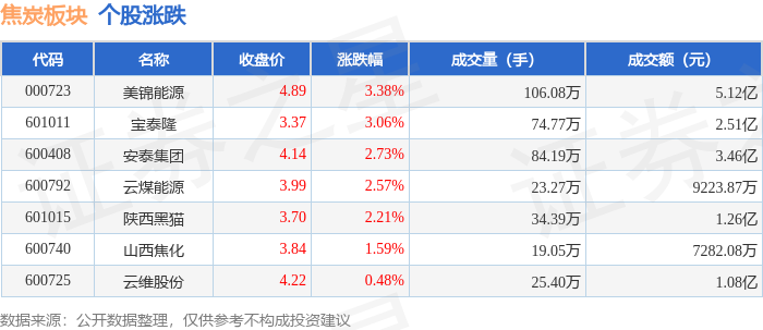 证券之星消息,1月6日焦炭板块较上一交易日上涨2.53%,美锦能源领涨。当日上证指数报收于 4083.67,上涨1.5%。深证成指报收于14022.55,上涨1.4%。焦炭板块个股涨跌见下表: | 代码 | 名称 | 收盘价 | 涨跌幅 | 成交量(手) | 成交额(元) | | --- | --- | --- | --- | --- | --- | | 000723 | 美锦能源 | 4.89 | 3.38% | 106.08万 | 5.12 乙 | | 601011 | 宝泰隆 | 3.37 | 3.06% | 74.77万 | 2.51亿 | | 600408 | 安泰集团 | 4.14 | 2.73% | 84.19万 | 3.46 Z | | 600792 | 云煤能源 | 3.99 | 2.57% | 23.27万 | 9223.87万 | | 601015 | 陕西黑猫 | 3.70 | 2.21% | 34.39万 | 1.26亿 | | 600740 | 山西焦化 | 3.84 | 1.59% | 19.05万 | 7282.08万 | | 600725 | 云维股份 | 4.22 | 0. ...