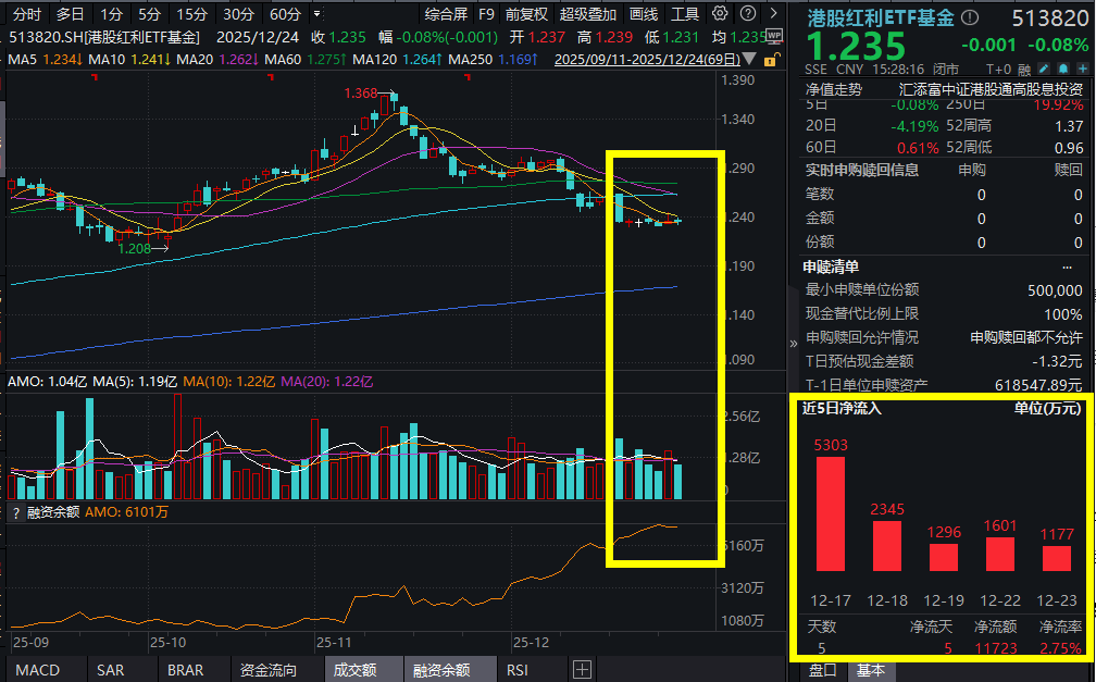 港股本周圣诞提前休市!港股红利ETF基金(513820)溢价走阔达0.73%,资金连续17日涌入超6亿元!跌出性价比?中信建投:开启中期配置窗口