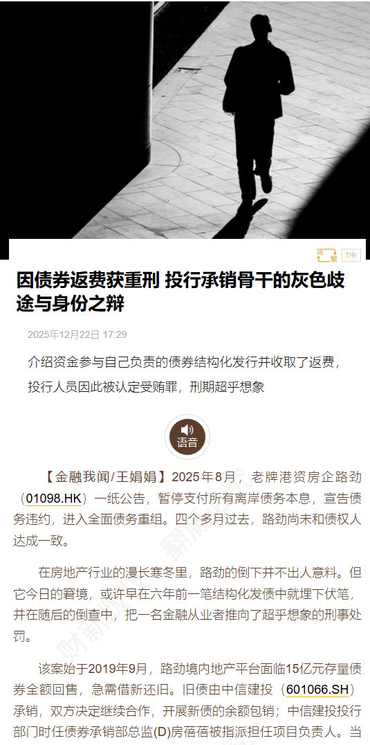 案件核心事实 - 中信建投证券原债券承销部执行总经理、江西区域负责人房蓓蓓因在2019年路劲地产公司债发行过程中私下收受“返费”构成受贿罪 [1] - 2025年12月5日,黑龙江省齐齐哈尔市龙沙区人民法院一审判决房蓓蓓有期徒刑10年6个月,其累计涉案金额超过540万元 [1][13] 涉案债券发行项目 - 涉案债券为路劲地产境内平台于2019年发行的“19路劲01”公司债,发行人为北京路劲隽御房地产开发有限公司 [4][5][16][17] - 该债券发行于2019年8月26日,主承销商及债券受托管理人为中信建投证券股份有限公司 [6][7][18][19] - 根据募集说明书,项目负责人为房蓓蓓,主承销商声明由法定代表人(授权代表人)黄凌签字 [9][21] 案件背景与影响 - 案件始于2019年9月,路劲地产境内平台面临15亿元存量债券全额回售,急需借新还旧,因此决定与中信建投合作开展新债的余额包销 [15] - 房蓓蓓作为中信建投投行部门时任债券承销部总监,被指派担任该项目负责人 [15] - 房蓓蓓被指控介绍资金参与自己负责的债券结构化发行并收取返费 [15] - 2025年8月,路劲地产公告暂停支付所有离岸债务本息,宣告债务违约并进入全面债务重组 [15] 相关人员其他活动 - 2022年3月16日,房蓓蓓曾以中信建投证券债承部执行总经理、江西区域总负责人的身份参与活动,并表示将为当地经济社会发展提供专业金融服务 [11][23][25]