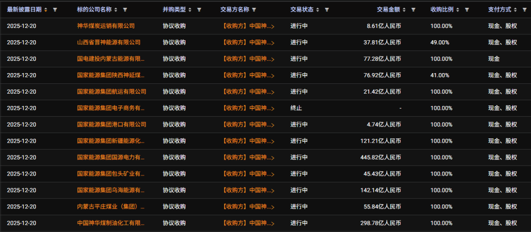 中国神华千亿级并购案核心信息 - 中国神华于12月19日晚间公告,拟通过发行A股股份及支付现金方式,收购控股股东国家能源集团旗下12家核心企业股权,交易总对价达1335.98亿元人民币,并同步推进配套募集资金 [1][5] - 此次重组覆盖煤炭生产、坑口煤电、煤化工及煤炭物流等关键能源领域,旨在彻底打通集团内部“煤电路港航化”全产业链堵点 [2][6][3][7] - 交易完成后,中国神华总资产规模将增加超2000亿元人民币,煤炭可采储量、年产量及发电装机容量等核心指标均大幅提升,其中聚烯烃产量增幅高达213.33% [2][6] 具体交易标的详情 - 本次收购涉及12家标的公司(其中1家交易状态为“终止”),交易金额从4.74亿人民币到445.82亿人民币不等,多数标的收购比例为100% [2][6] - 主要标的公司及对价包括:国家能源集团国源电力有限公司(445.82亿人民币)、中国神华煤制油化工有限公司(298.78亿人民币)、国家能源集团乌海能源有限公司(142.14亿人民币)、国家能源集团新疆能源化工有限公司(121.21亿人民币)等 [2][6] - 支付方式主要为“现金、股权”组合,部分交易为纯现金支付 [2][6] 并购的战略意义与行业背景 - 此次重组被视作央企善用资本市场增强产业链韧性和竞争力、加快建设世界一流企业的重要体现,其逻辑已从追求规模扩张的“物理合并”转向聚焦主业、创造价值的“化学融合” [3][7][4][8] - 2025年是国有企业改革深化提升行动收官之年,国有经济布局优化和结构调整呈现重组整合提速、产业导向鲜明等特征 [3][7] - 截至12月21日,年内A股国有控股上市公司已发生超过1000起并购交易案例,较去年同期保持平稳增长 [3][7] 国有控股上市公司并购趋势 - 国有控股上市公司并购聚焦主责主业,加速剥离非核心资产,推动资源向核心业务集中,避免重复建设与无序竞争 [3][7] - 同时,国有控股上市公司持续加码战略性新兴产业布局,新质生产力培育成为重点方向,半导体、新能源、高端装备等“硬科技”领域并购进程明显加快 [3][7] 未来央国企并购重组展望 - 预计2026年央国企并购重组将围绕横向整合、纵向整合、创新整合三大主线展开 [4][8] - 横向整合侧重于在传统行业合并“同类项”,打造全球竞争力行业龙头;纵向整合由“链长”企业主导,沿产业链上下游整合,打造自主可控产业生态;创新整合则集中在战略性产业,由科技领军企业整合创新资源 [4][8] - 预计央国企并购重组将主要依托资本市场这个主战场展开 [4][8]