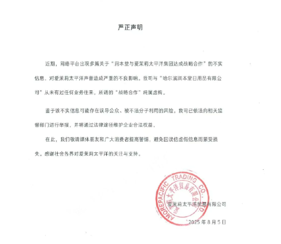 爱茉莉太平洋否认润本堂达合作:从未有过任何业务往来,所谓“战略合作”纯属虚构