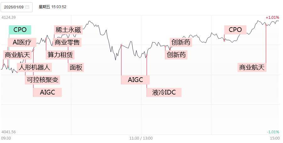 1月9日,市场震荡拉升,沪指高开高走突破4100点,深成指涨超1%。沪深两市成交额3.12万亿,较上一个交易日放量3224亿,时隔73个交易日后再度站上3 万亿大关,历史第五次突破3万亿成交量。盘面上,市场热点快速轮动,全市场超3900只个股上涨,连续2日超百股涨停。 从板块来看,AI应用概念集体爆发,二十余只成分股涨停,引力传媒5天4板,省广集团、会畅科技、粤传媒、易点天下涨停。商业航天概念早盘一度跳 水,但午后又获得资金踊跃承接,逾40股涨停或涨超10%,其中鲁信创投11天9板,金风科技10天6板,中国卫通9天5板,金风科技4连板,航天电子6天4 板。可控核聚变概念延续强势,弘讯科技、中国一重双双3连板。下跌方面,脑机接口概念下挫,美好医疗、倍益康跌超10%。截至收盘,沪指涨0.92%,深 成指涨1.15%,创业板指涨0.77%。 今日全市场(不含ST股、退市股)共94股涨停,连板股总数19只,46股封板未遂,封板率为67%。焦点股方面,AI应用端在志特新材20CM 5连板的带动下 爆发,将近40股涨停或者涨幅超10%,其中:快意电梯5连板,引力传媒5天4板,易点天下、迪安诊断、会畅科技、天龙集团、昆仑万 ...