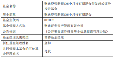 基金经理变更 - 财通证券资产管理有限公司增聘金御为财通资管新聚益6个月持有期混合基金经理 [1][2] - 新任基金经理金御曾任职于洛阳银行股份有限公司和中原银行股份有限公司 2023年2月加入公司 现任固收多策略公募投资部基金经理 [1] - 该基金共同管理基金经理还包括马航 [2] 基金业绩表现 - 财通资管新聚益6个月持有期混合A/C类份额成立于2021年12月24日 [1] - 截至2025年5月12日 A类份额今年来收益率1.96% 累计收益率9.88% 累计净值1.0988元 [1] - C类份额今年来收益率1.80% 累计收益率8.45% 累计净值1.0845元 [1] 基金基本信息 - 基金全称财通资管新聚益6个月持有期混合型发起式证券投资基金 [2] - 基金简称财通资管新聚益6个月持有期混合 [2] - 基金主代码012052 [2] - 基金管理人为财通证券资产管理有限公司 [2]