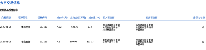 1月5日,华鼎股份大宗交易成交271.33万股,成交额1223.75万元,占当日总成交额的5%,成交均价 4.51元,较市场收盘价4.76元折价5.25%,其中最高成交价4.52元,最低成交价4.5元。 | 交易日期 | 证券简称 | 证券代码 | | | 成交价(元) 成交金额(万元) 成交量(*) 买入营业部 | | 类出营业部 | 是否为专场 | | | --- | --- | --- | --- | --- | --- | --- | --- | --- | --- | | 2026-01-05 | 华贵殿的 | 601113 | 4.52 | 623.76 | 138 | 公司 2017年度 | ុំគឺនិងប្រទេសចរន | | 客 | | 2026-01-05 | 华贵股份 | 601113 | 4.5 | 599.99 | 133.33 | 表哥早餐劈发有限 | 菜酒店交易考试客运 | | Ka | ...