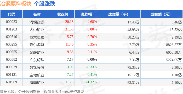 市场整体表现 - 2023年12月24日,冶钢原料板块整体上涨0.45%,表现强于上证指数(上涨0.53%)和深证成指(上涨0.88%)[1] - 板块内个股涨跌互现,在统计的9只个股中,5只上涨,3只下跌,1只收平[1] 个股价格表现 - 河钢资源领涨板块,收盘价为20.13元,单日涨幅达4.68%[1] - 大中矿业上涨0.80%,收于31.38元[1] - 方大炭素上涨0.70%,收于5.75元[1] - 鄂尔多斯上涨0.35%,收于11.40元[1] - 金岭矿业微涨0.11%,收于9.38元[1] - 广东明珠股价持平,收于7.17元[1] - 钢钛股份下跌0.33%,收于3.05元[1] - 宝地矿业下跌0.41%,收于7.27元[1] - 示范围换下跌1.32%,收于11.25元[1] 个股成交情况 - 河钢资源成交17.43万手,成交额3.46亿元[1] - 大中矿业成交48.93万手,成交额15.52亿元[1] - 方大炭素成交38.23万手,成交额2.19亿元[1] - 鄂尔多斯成交7.79万手,成交额8823.57万元[1] - 金岭矿业成交6.44万手,成交额6053.38万元[1] - 广东明珠成交7.36万手,成交额5274.65万元[1] - 钢钛股份成交75.35万手,成交额2.30亿元[1] - 宝地矿业成交15.12万手,成交额1.10亿元[1] - 示范围换成交63.31万手,成交额7.10亿元[1] 板块资金流向 - 冶钢原料板块整体呈现主力资金净流出,净流出额为4508.09万元[1] - 游资资金整体净流入941.82万元[1] - 散户资金整体净流入3566.26万元[1] 个股资金流向明细 - 宝地矿业主力资金净流入2677.35万元,占成交额的24.40%,游资与散户资金则呈现净流出[2] - 河钢资源主力资金净流入1382.53万元,占成交额的4.00%[2] - 广东明珠主力资金净流入66.90万元,占成交额的1.27%[2] - 金岭矿业主力资金小幅净流出14.03万元,占成交额的-0.23%[2] - 鄂尔多斯主力资金净流出207.01万元,占成交额的-2.35%[2] - 钢钛股份主力资金净流出499.44万元,占成交额的-2.17%[2] - 大中矿业主力资金净流出821.97万元,占成交额的-0.53%,但游资大幅净流入5628.99万元[2] - 方大炭素主力资金净流出1793.25万元,占成交额的-8.18%[2] - 海南矿业主力资金大幅净流出5299.17万元,占成交额的-7.47%[2]