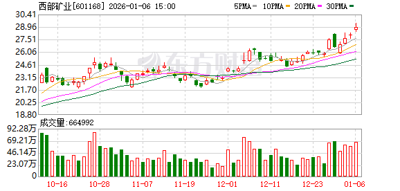 1月7日,西部矿业盘中下跌2.00%,截至10:02,报28.38元/股,成交5.47亿元,换手率0.80%,总市值 676.30亿元。 资金流向方面,主力资金净流出3617.60万元,特大单买入3578.49万元,占比6.54%,卖出5617.23万 元,占比10.27%;大单买入1.32亿元,占比24.23%,卖出1.48亿元,占比27.12%。 西部矿业今年以来股价涨2.68%,近5个交易日涨6.73%,近20日涨7.91%,近60日涨21.08%。 资料显示,西部矿业股份有限公司位于青海省西宁市海湖新区文逸路4号西矿·海湖商务中心1号楼,成 立日期2000年12月28日,上市日期2007年7月12日,公司主营业务涉及主要从事铜、铅、锌、铁等基本 有色金属、黑色金属的采选、冶炼、贸易等业务。主营业务收入构成为:销售商品99.70%,利息、手 续费及佣金0.27%,提供服务0.03%。 西部矿业所属申万行业为:有色金属-工业金属-铜。所属概念板块包括:有色锌、黄金股、钴镍、有色 铜、稀缺资源等。 截至12月31日,西部矿业股东户数11.55万,较上期增加1.76%;人均流通股20632股,较上期减少 1. ...