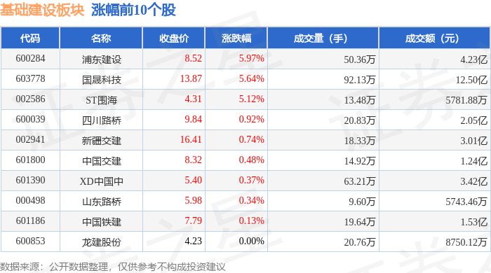 市场整体表现 - 12月23日,基础建设板块整体下跌0.2%,表现弱于大盘,当日上证指数上涨0.07%,深证成指上涨0.27% [1] - 板块内个股表现分化,领涨股为浦东建设(上涨5.97%)和圖晟科技(上涨5.64%),领跌股为东珠生态(下跌5.40%)和*ST正平(下跌4.90%) [1][2] 个股价格与交易情况 - 浦东建设收盘价为8.52元,成交量50.36万手,成交额4.23亿元,涨幅居板块首位 [1] - 圖晟科技收盘价为13.87元,成交量92.13万手,成交额12.50亿元,涨幅居板块第二 [1] - 东珠生态收盘价为8.06元,成交量20.80万手,成交额1.70亿元,跌幅居板块首位 [2] - *ST正平收盘价为4.46元,成交量56.30万手,成交额2.53亿元,跌幅居板块第二 [2] - 中国交建收盘价为8.32元,上涨0.48%,成交额1.24亿元 [1] - XD中国中收盘价为5.40元,上涨0.37%,成交额3.42亿元 [1] 板块资金流向 - 当日基础建设板块整体呈现主力资金净流出,净流出额为2.46亿元 [2] - 游资资金净流入4499.56万元,散户资金净流入2.01亿元 [2] - 个股方面,浦东建设主力资金净流入最多,达4200.97万元,主力净占比9.93% [3] - 中国核建主力资金净流入2274.10万元,主力净占比3.17% [3] - 新疆交建主力资金净流入1948.57万元,主力净占比6.48% [3] - 龙建股份主力资金净流入1025.43万元,但主力净占比高达11.72% [3] - 北新路桥主力资金净流入1030.81万元,同时游资净流入1083.47万元 [3]