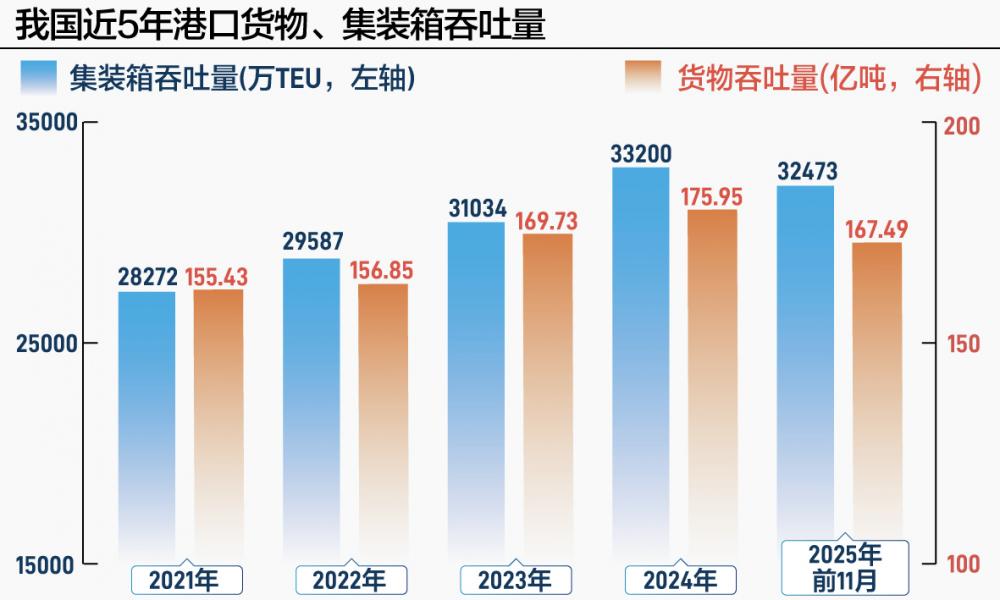 记者丨柳宁馨 实习生蒋瑛芙 编辑丨陈洁 过去一年,全球贸易环境不确定性加大,但我国港口吞吐量逆势增长。 2025年前11个月,我国港口完成货物吞吐量167.5亿吨,同比增长4.4%。与此相对应,全球经济波动下,中国贸易依旧保持强劲韧性。2025年前11个月,我 国货物贸易出口24.46万亿元,同比增长6.2%。 从2025年全年来看,主要港口也交出了令人满意的成绩单。2025年,上海港、宁波舟山港等枢纽港稳居全球前列,宁波舟山港成为全球首个年货物吞吐量超 14亿吨的大港,上海港集装箱吞吐量连续第十六年位居全球港口首位。洋浦港、北部湾港等新兴港口增势突出,2025年洋浦港集装箱吞吐量同比大增65%, 北部湾港则迈入千万标箱大港行列。 | 序号 | 潜口 | 集聚 言词 | 同比增速(%) | | --- | --- | --- | --- | | | | ( 万TEU) | | | 1 | 换奥上 | 5 056 | 6.7 | | 2 | 宁波舟山港 | 3 999 | 10.6 | | 3 | 深圳港 | 3 241 | 6.6 | | ব | 青岛港 | 3 037 | 7.0 | | 5 | 广州港 | ...