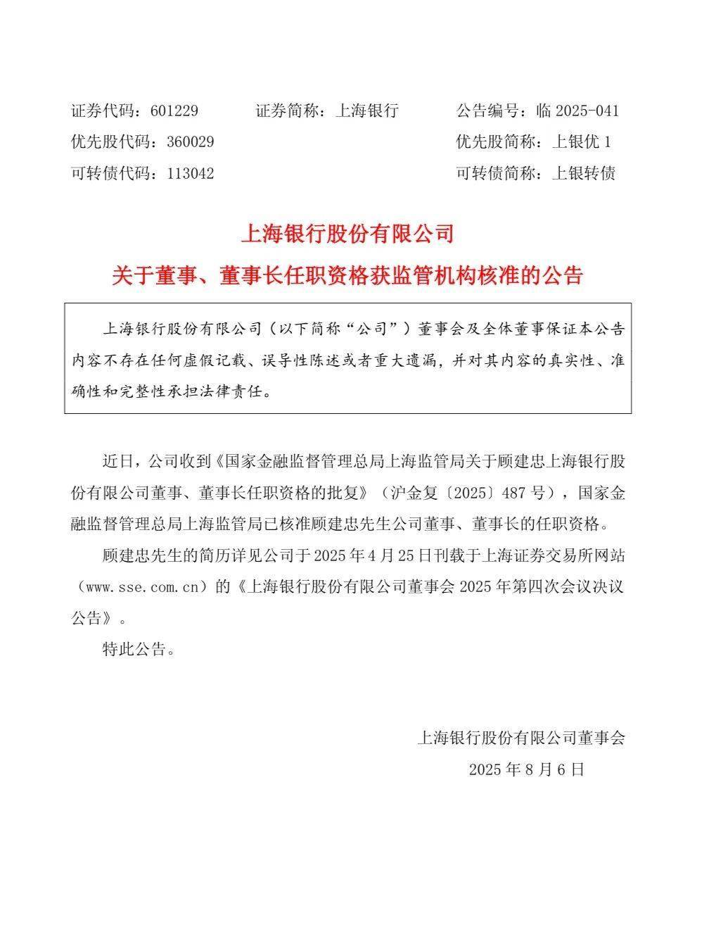 公司治理变动 - 国家金融监督管理总局上海监管局核准顾建忠担任上海银行董事及董事长职务 沪金复〔2025〕487号文件确认其任职资格 [1] - 顾建忠个人履历详情已通过上海银行董事会2025年第四次会议决议公告披露 该公告于2025年4月25日发布于上海证券交易所网站 [1] - 本次人事任命公告由上海银行董事会于2025年8月6日正式发布 [3]