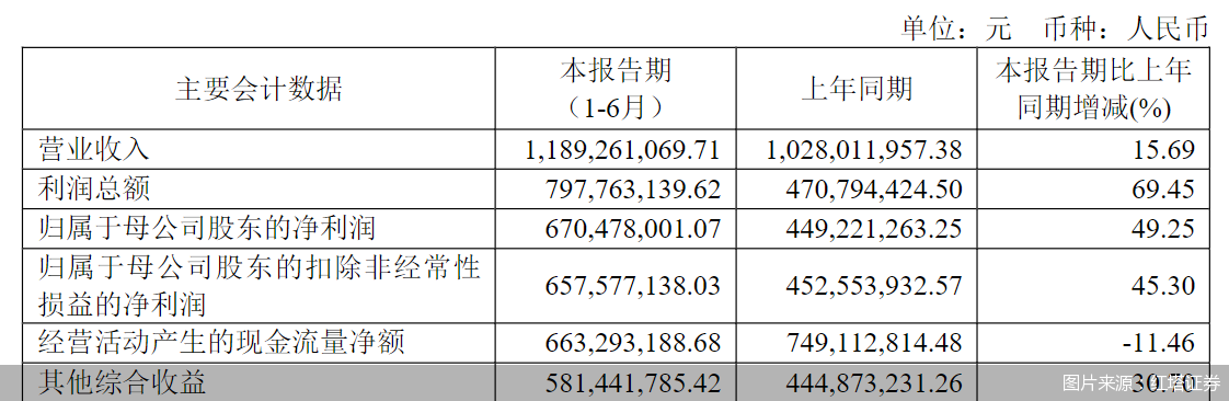 财务表现 - 营业收入11.89亿元 同比增长15.69% [1] - 利润总额7.98亿元 同比大幅增长69.45% [1] - 归母净利润6.70亿元 同比增长49.25% [1] 盈利能力 - 扣非归母净利润6.58亿元 同比增长45.30% [1] - 经营活动现金流量净额6.63亿元 同比下降11.46% [1] - 其他综合收益5.81亿元 较上年同期4.45亿元实现增长 [1]