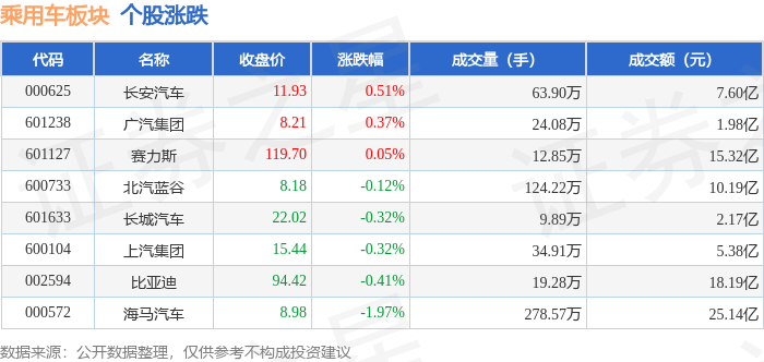 从资金流向上来看,当日乘用车板块主力资金净流出7.87亿元,游资资金净流入1.75亿元,散户资金净流 入6.13亿元。乘用车板块个股资金流向见下表: | 代码 | 名称 | 收盘价 | 涨跌幅 | 成交量(手) | 成交额(元) | | --- | --- | --- | --- | --- | --- | | 000625 | 长安汽车 | 11.93 | 0.51% | 63.90万 | 7.60亿 | | 601238 | 广汽集团 | 8.21 | 0.37% | 24.08万 | 1.98亿 | | 601127 | 赛力斯 | 119.70 | 0.05% | 12.85万 | 15.32亿 | | 600733 | 北汽蓝谷 | 8.18 | -0.12% | 124.22万 | 10.19亿 | | 601633 | 长城汽车 | 22.02 | -0.32% | 9.89万 | 2.17亿 | | 600104 | 上汽集团 | 15.44 | -0.32% | 34.91万 | 5.38亿 | | 002594 | 比亚迪 | 94.42 | -0.41% | 19.28万 | 18.19 ...
