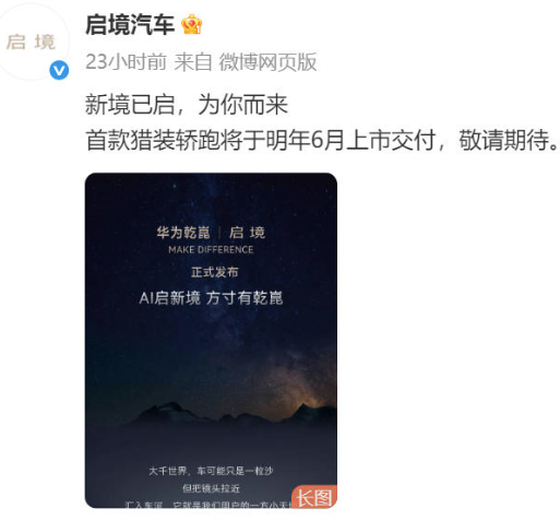 启境首款车型明年6月上市 搭载华为乾崑全栈智能技术