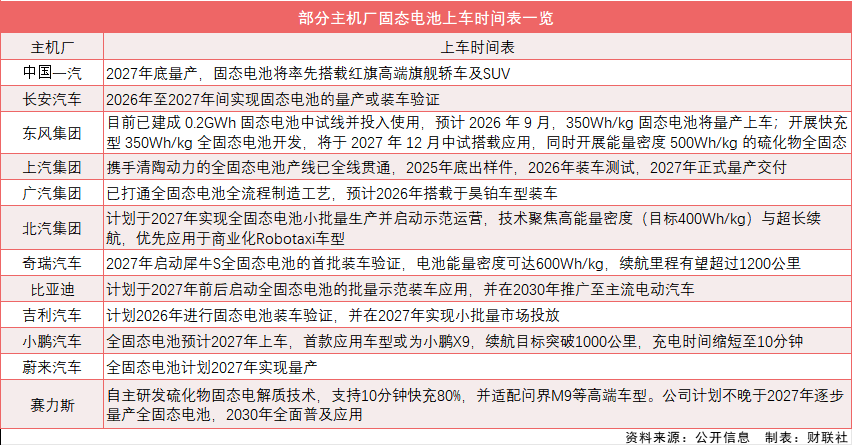 智通财经12月24日讯(记者 刘阳)在电动汽车快速发展的当下,无论是破解普通用户的里程"焦虑症",还是行业对安全 与效率的追求,均将目光投向了"锂电圣杯"的固态电池。 "众望所归"下,资本市场上固态电池板块持续升温。从2025年4月低点的696.24,到11月末的1314.15,智通财经固态电池 板块指数近一年来约57.3%的涨幅,成为今年固态电池表现的最好写照。其中,海科新源、上海洗霸、多氟多、中一科技 等年内均上涨超100%。而对主机厂而言,卡位固态电池上车进度,则已成为参与未来市场竞争的主要抓手。 据智通财经记者初步统计,截至目前,已有包括三大央企及比亚迪、吉利等在内的12家主流整车制造商于2025年披露了 各自固态电池的上车进度,均指向2026年装车验证、2027年初步量产这一时间节点。 | | 部分主机厂固态电池上车时间表一览 | | --- | --- | | 主机厂 | 上车时间表 | | 中国一汽 | 2027年底量产,固态电池将率先搭载红旗高端旗舰轿车及SUV | | 长安汽车 | 2026年至2027年间实现固态电池的量产或装车验证 | | 东风集团 | 目前已建成 0.2GWh 固态电池 ...