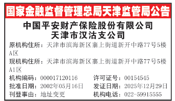 | 国家金融监督管理总局天津监管局公告 | | --- | | 中国平安财产保险股份有限公司 | | 天津市汉沽支公司 | | 原机构住所:天津市滨海新区寨上街道新开中路77号5楼 | | AX | | 现机构住所:天津市滨海新区寨上街道新开中路77号5楼 | | A1× | | 机构编码:000017120116 许可证号:00154545 | | 批准日期:2002年05月16日 发证日期:2025年12月29日 | | 刊登事由:地址变更 机构电话:022-59915555 | 转自:天津日报 (来源:天津日报) ...
