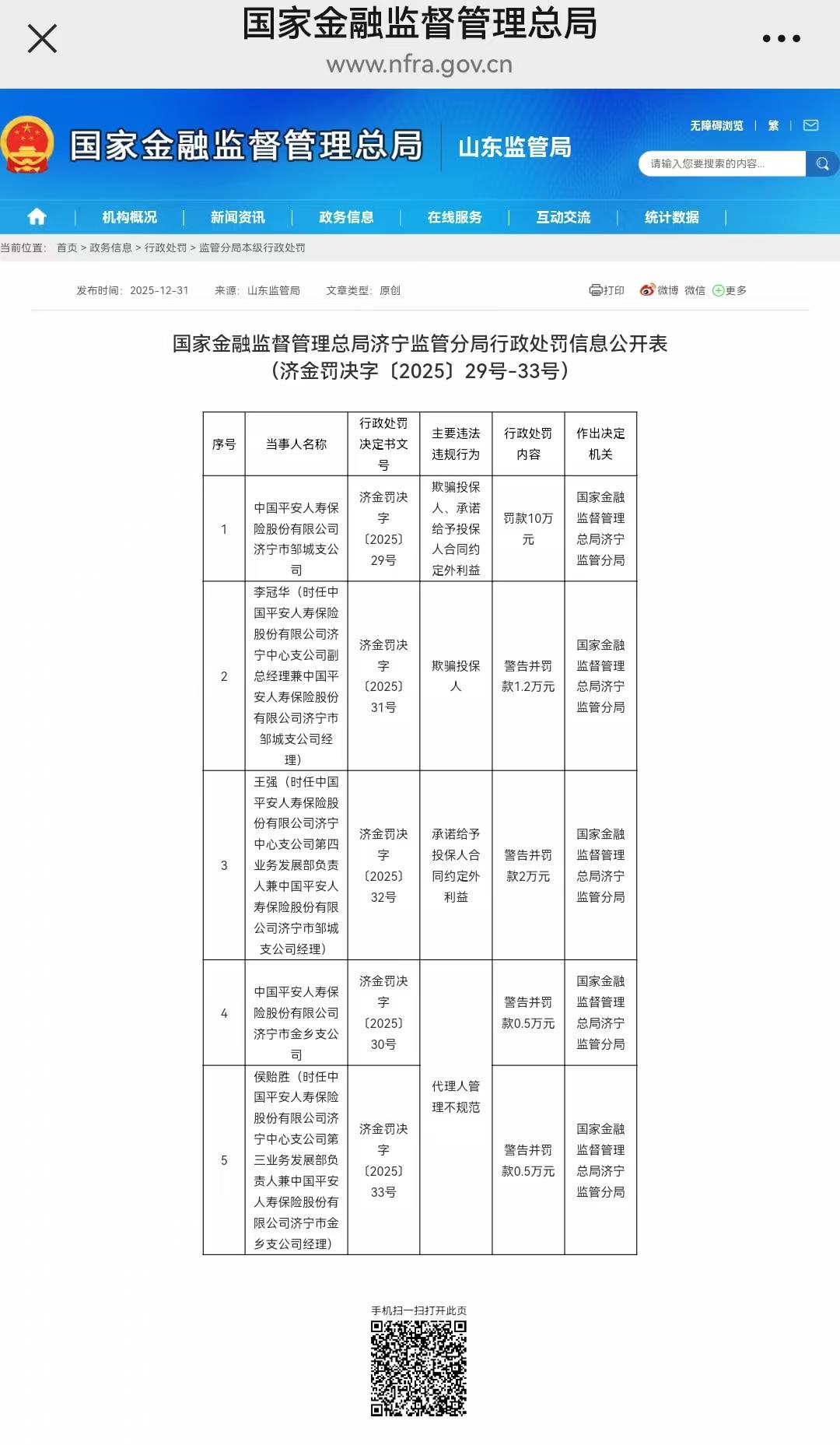 核心处罚事件 - 2025年12月31日,国家金融监督管理总局济宁监管分局对平安人寿下属两家支公司及相关责任人开出罚单,合计罚款14.2万元 [1] - 平安人寿济宁市邹城支公司因“欺骗投保人、承诺给予投保人合同约定外利益”被罚款10万元 [5] - 邹城支公司两名相关责任人李冠华、王强分别被警告并罚款1.2万元、警告并罚款2万元 [3][5] - 平安人寿济宁市金乡支公司因“代理人管理不规范”被警告并罚款0.5万元 [5] - 金乡支公司相关责任人侯贻胜被警告并罚款0.5万元 [3][5] 违规行为分析 - 邹城支公司的违规行为属于销售误导,具体表现为欺骗投保人及承诺合同外利益,此类行为通常涉及夸大产品收益、混淆概念或通过赠送礼品、返现等方式诱导消费 [5] - 金乡支公司的违规行为属于代理人管理问题,管理不规范往往与误导销售行为相伴相生,为违规行为提供了滋生土壤 [5] - 两家支公司的违规行为集中于销售误导和代理人管理两大保险业典型监管领域 [5] 历史违规与内控问题 - 此次违规并非孤立事件,而是“旧病复发”,平安人寿济宁中心支公司曾在2023年5月29日因多项违规被罚没46.1万元 [6] - 2023年的违规行为包括:编制虚假财务资料、欺骗投保人、未及时注销离职代理人执业登记、委托未经执业登记的个人从事保险代理业务 [6] - 在2023年的罚单中,金乡支公司已有个人代理人因“欺骗投保人、介绍保险产品时夸大保险收益”被单独处罚,显示其代理人管理问题根源至少可追溯至两年前 [6] - 从中心支公司到县域支公司,从机构到个人,从财务造假到销售误导,系列罚单指向公司内控管理乏力、合规文化淡薄的深层系统性问题 [7] - 本次县域支公司受罚是过往系统性问题和粗放式发展模式在局部的再现和下沉蔓延 [7]