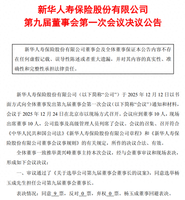 12月24日,新华人寿保险股份有限公司(以下简称"新华保险(601336)")发布第九届董事会第一次会议决议公告。公告称,该公司于2025年 12月12日以书面方式向全体董事发出第九届董事会第一次会议通知和材料,会议于2025年12月24日在北京市以现场方式召开,审议通过了 《关于选举公司第九届董事会董事长的议案》,同意选举杨玉成担任公司第九届董事会董事长。 2019年5月至2023年8月,杨玉成任申万宏源集团股份有限公司和申万宏源证券(000562)有限公司党委副书记,申万宏源证券有限公司执行 董事、总经理; 新华保险官网信息显示,杨玉成自2023年12月起担任该公司执行董事、董事长,自2023年8月起担任该公司党委书记。 2014年12月至2019年5月,担任申万宏源集团股份有限公司和申万宏源证券有限公司党委委员,申万宏源集团股份有限公司监事长。 2008年5月至2014年12月,在宏源证券股份有限公司历任党委委员、纪委书记、副总经理、监事长。 此前,杨玉成曾任国家国有资产管理局主任科员,国务院稽察特派员助理,中共中央企业工作委员会国有企业监事会专职监事,中国网络通 信有限公司综合部总监,中国经济技术投资 ...
