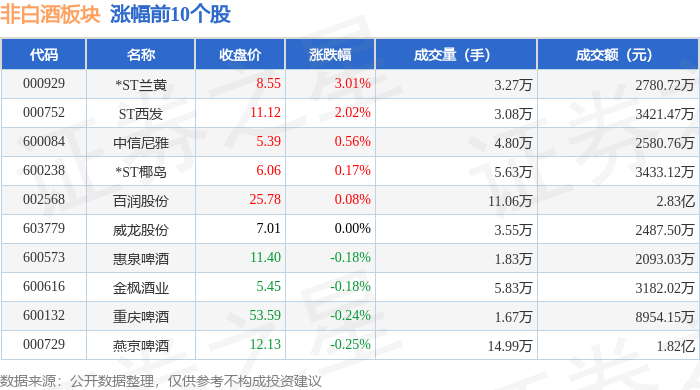 | 代码 | 名称 | 收盘价 | 涨跌幅 | 成交量(手) | 成交额(元) | | --- | --- | --- | --- | --- | --- | | 601579 | 会稽山 | 20.52 | -1.91% | 6.67万 | 1.38亿 | | 600600 | 震盤暗 | 65.92 | -0.96% | 5.12万 | 3.39亿 | | 002461 | 珠江啤酒 | 10.01 | -0.89% | 4.48万 | 4484.93万 | | 000869 | 张裕A | 21.67 | -0.60% | 9348.5 | 2026.55万 | | 600543 | 草高股份 | 5.90 | -0.51% | 4.45万 | 2625.07万 | | 600059 | 古越龙山 | 9.56 | -0.42% | 4.76万 | 4559.99万 | | 000729 | 武京啤酒 | 12.13 | -0.25% | 14.99万 | 1.82亿 | | 600132 | 重庆啤酒 | 53.59 | -0.24% | 1.67万 | 8954.15万 | | 600616 | 金 ...