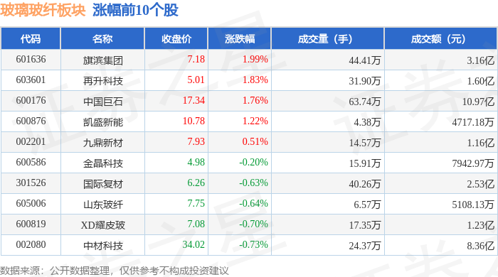 证券之星消息,9月30日玻璃玻纤板块较上一交易日上涨0.25%,旗滨集团领涨。当日上证指数报收于 3882.78,上涨0.52%。深证成指报收于13526.51,上涨0.35%。玻璃玻纤板块个股涨跌见下表: 从资金流向上来看,当日玻璃玻纤板块主力资金净流出2.11亿元,游资资金净流入5380.73万元,散户资 金净流入1.57亿元。玻璃玻纤板块个股资金流向见下表: | 代码 | 名称 | 收盘价 | 涨跌幅 | 成交量(手) | 成交额(元) | | | --- | --- | --- | --- | --- | --- | --- | | 601636 | 旗滨集团 | 7.18 | 1.99% | 44.41万 | | 3.16亿 | | 603601 | 再升科技 | 5.01 | 1.83% | 31.90万 | | 1.60亿 | | 600176 | 中国目石 | 17.34 | 1.76% | 63.74万 | | 10.97亿 | | 600876 | 凯盛新能 | 10.78 | 1.22% | 4.38万 | | 4717.18万 | | 002201 | 九鼎新材 | 7.93 | 0. ...