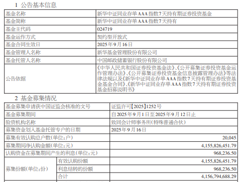 基金基本信息 - 基金名称为新华中证同业存单AAA指数7天持有期证券投资基金 [1][2] - 基金主代码为024719 [2] - 基金运作方式为契约型开放式 [2] - 基金合同生效日为2025年9月16日 [2] - 基金管理人为新华基金管理股份有限公司 [1][2] - 基金托管人为中国邮政储蓄银行股份有限公司 [2] 基金募集情况 - 募集期间净认购金额为4,155,826,451.79元 [1][2] - 认购资金在募集期间产生的利息为968,236.50元 [1][2] - 募集份额合计为4,156,794,688.29份 [1][2] - 募集有效认购户数为20,045户 [2] - 基金募集期间为2025年9月1日至2025年9月12日 [2] - 募集资金划入基金托管专户的日期为2025年9月16日 [2] 基金经理信息 - 基金经理李洁历任中债信用业务经理和高级经理 [1] - 李洁于2015年9月加入新华基金管理股份有限公司 [1] - 李洁现任固定收益与平衡投资部基金经理 [1]