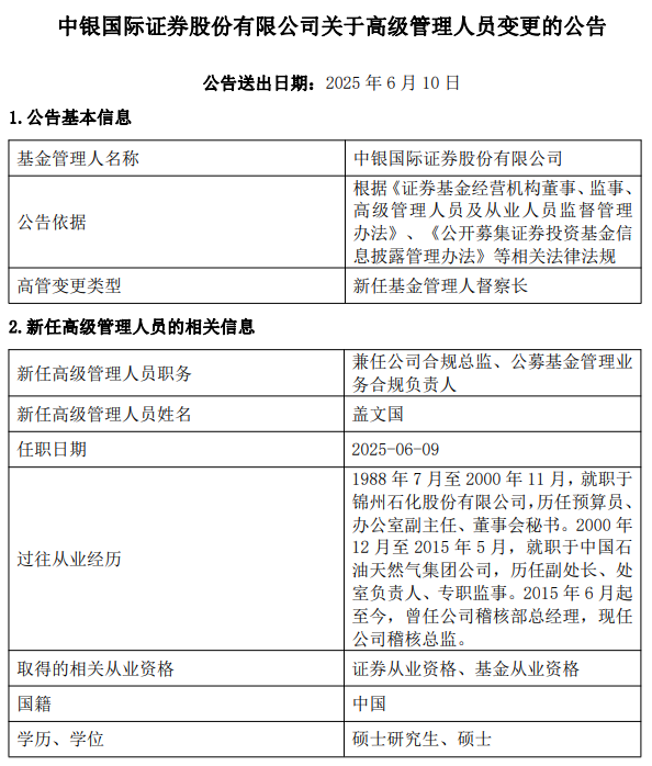 高管变更 - 中银国际证券股份有限公司发布高级管理人员变更公告,盖文国兼任公司合规总监、公募基金管理业务合规负责人 [1][3] - 新任高管盖文国任职日期为2025年6月9日 [4] - 高管变更类型为新任基金管理人督察长 [3] 新任高管背景 - 盖文国1988年7月至2000年11月就职于锦州石化股份有限公司,历任预算员、办公室副主任、董事会秘书 [1][4] - 2000年12月至2015年5月就职于中国石油天然气集团公司,历任副处长、处室负责人、专职监事 [1][4] - 2015年6月起至今曾任公司稽核部总经理,现任公司稽核总监 [1][4] - 盖文国取得证券从业资格、基金从业资格,学历为硕士研究生、硕士 [4] 公告依据 - 公告依据为《证券基金经营机构董事、监事、高级管理人员及从业人员监督管理办法》、《公开募集证券投资基金信息披露管理办法》等相关法律法规 [3]
