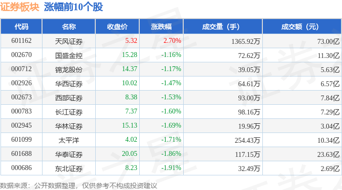 证券板块整体表现 - 证券板块较上一交易日下跌2.32% [1] - 上证指数下跌1.18%至3573.21点,深证成指下跌1.73%至11009.77点 [1] - 板块主力资金净流出63.88亿元,游资资金净流入14.95亿元,散户资金净流入48.93亿元 [2] 领跌个股表现 - 中银证券领跌板块,跌幅达5.40%,成交额40.04亿元 [2] - 哈投股份跌幅3.91%,成交额5.13亿元 [2] - 东吴证券跌幅2.95%,成交额10.87亿元 [2] 资金流向特征 - 天风证券主力净流入7.20亿元(占比9.86%),但游资与散户均呈净流出状态 [3] - 西部证券主力净流入1074.65万元(占比1.37%),游资净流入1569.82万元(占比2.00%) [3] - 中信建投主力净流出3801.50万元(占比7.24%),散户净流入3604.63万元(占比6.87%) [3] 个股成交活跃度 - 太平洋成交量254.43万手,成交额10.34亿元 [1] - 华泰证券成交额23.63亿元,成交量117.15万手 [1] - 天风证券成交量1365.92万手,为板块最高 [1]